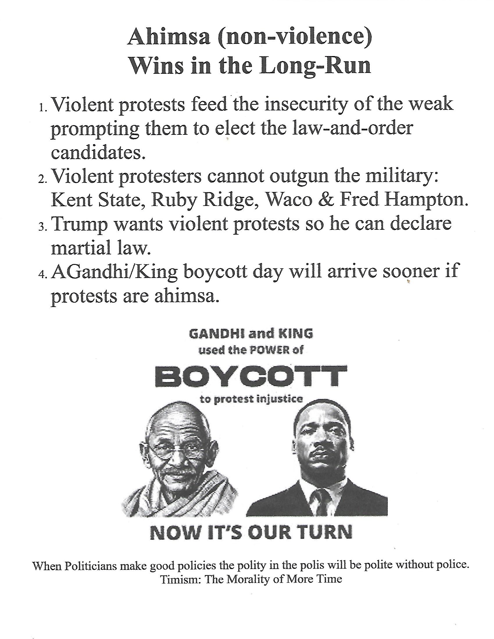 See Ahimsa(non-violent) poster and Safe, Productive Protesting.